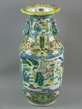A good 19th Century Chinese Famille Verte vase, profuse vivid enamel decoration with bordered panels of worshipful scenes, applied salamander and dog decoration with inverted lobe edged rim in yellow with insect and floral decoration, deep dish semi-glazed base unmarked, 38 x 17 cms (professional restoration work has been undertaken on the rim)