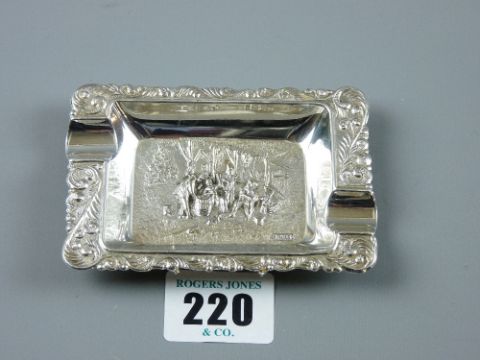 A Continental white metal oblong ashtray with floral border and panel of figures to the centre at work