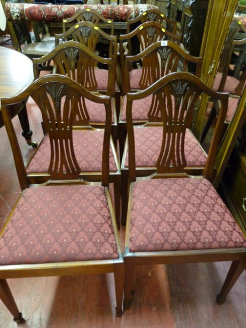 A reproduction set of eight (six plus two) mahogany dining chairs with pierced splat and wheatsheaf decorated backs, square tapering front supports on spade feet with upholstered drop-in seats
