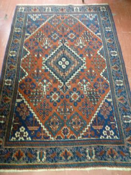 An antique Nomadic Josheghan rug, c1840, wide bordered blue and red with geometric design, 200 x 130 cms (Description as per original receipt)