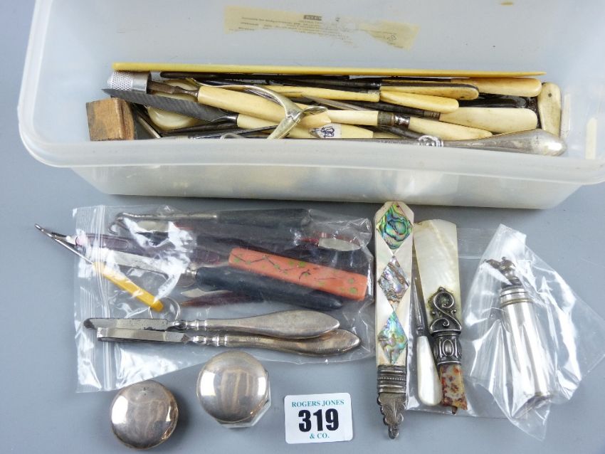 A large parcel of mainly bone handled hooks etc and a pair of silver handled manicure instruments with small silver topped bowl