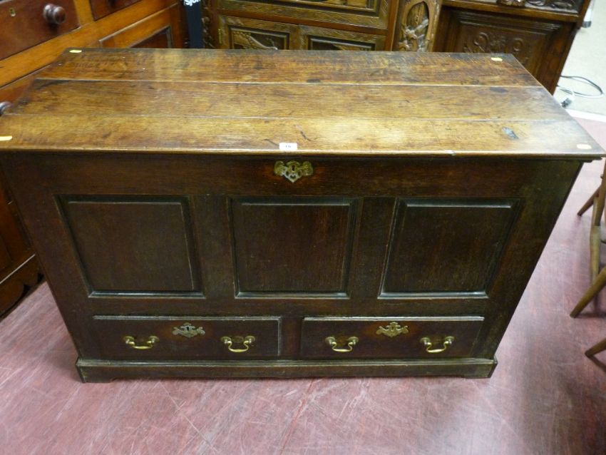 An 18th Century oak panel sided mule chest, polished three plank lift-up lid with iron lock and pierced brass escutcheon, triple chamfered panel front over two base drawers with brass swan neck handles and escutcheons on stile feet with applied moulded frieze, 76 x 116 cms, the drawers oak lined