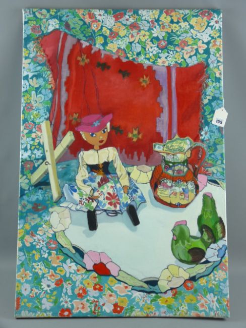 CAROLYN VERNON oil on canvas, unframed - puppet and Masons jug on a table, signed verso with artist's London address and date March, 1985, 91 x 66 cms