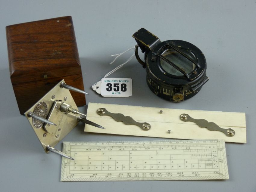 A white metal, possibly engineer's/architect's measuring gauge in a velvet lined rosewood box, applied plaque reads 'Registered Feb 3, 1845, E.B. Webb C.E, Barnstaple', 5.25 cms square, an ivory parallel rule and one other and a World War II military compass made by T G & Co Ltd, London, no. B177655, dated 1942, mark III version