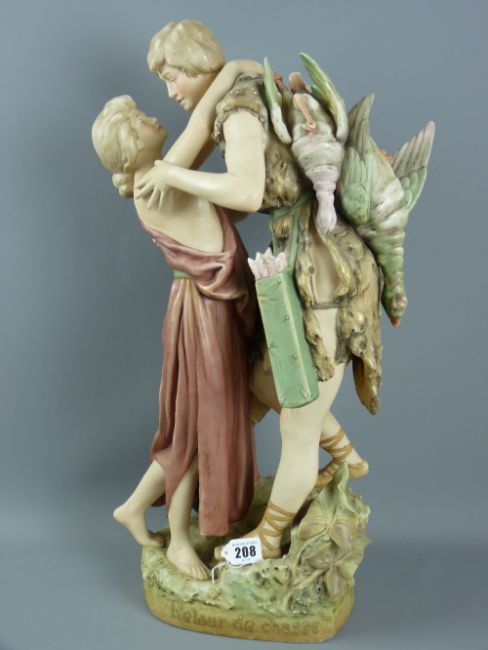 A large Royal Dux figural group titled 'Relour de Chasse (Return of the Hunter)', modelled by Hampel, a classically dressed young couple in embrace, the young man with tethered game, the whole in usual blush Dux colours with gilt highlighting, raised pink triangle mark to the base 'Royal Dux, Bohemia' and the letter 'E', impressed numbers 1526, 58 cms high
