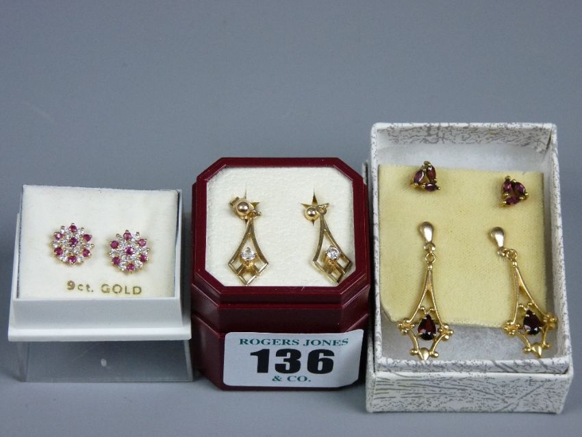 A pair of diamond and ruby cluster stud earrings with twelve tiny diamonds and seven rubies each, two pairs of pierced drop earrings set with semi-precious stones and a further pair of stud earrings with triple, possibly amethyst setting