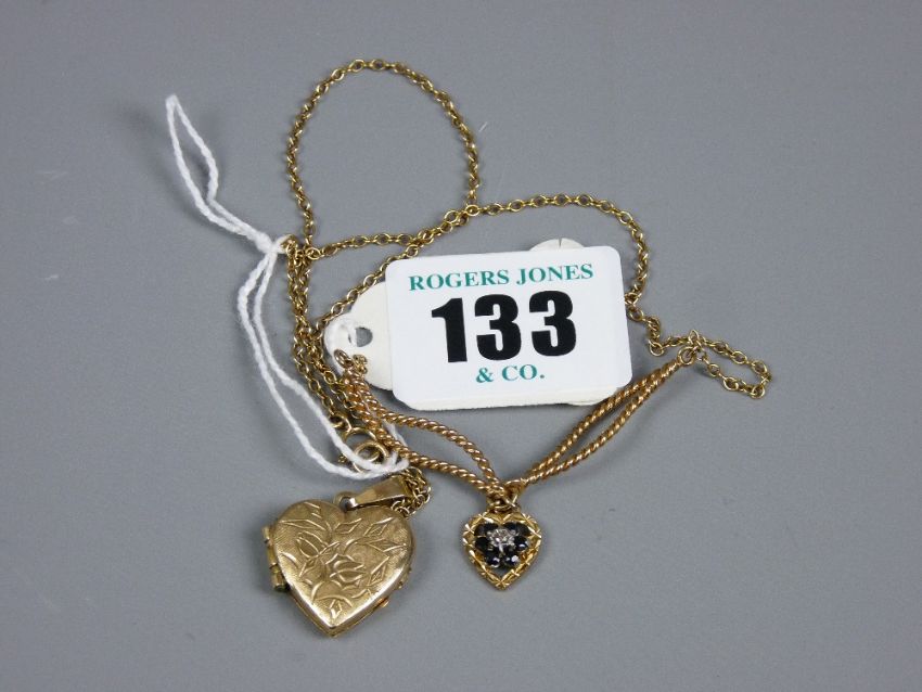A gold heart shaped locket marked 375 and a 16 ins gold chain with heart shaped pendant and diamond and probably blue sapphire setting, the clasp marked nine carat, 8 grms total approximately