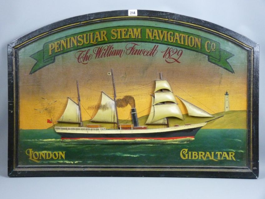 A 20th Century arch top sign for 'Peninsula Steam Navigation Co' of a three masted steam ship in full sail titled 'The William Fawcett, 1829, London, Gibraltar', 60 x 89 cms