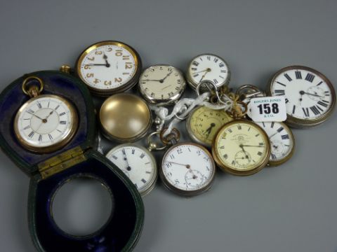 Nine metal cased pocket watches and an uncased travel clock, a silver pocket watch case with bullseye glass, an Edwardian pocket watch case and three winding keys