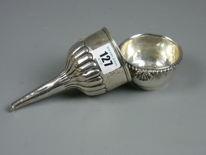 A 19th Century silver wine funnel with detachable strainer having a gadrooned border, the funnel with fluted decoration and rampant lion crest, maker's mark for probably Rebecca Emes and Edward Barnard, further marks quite polished, 14.5 cms long, approximately 4 troy ozs