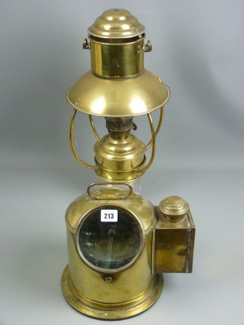 An early 20th Century ship's gimbal compass in a brass pinnacle housing with side spirit burner and carrying handle, 24 cms high along with a brass ship's lamp with carrying/hanging handle, 43 cms high