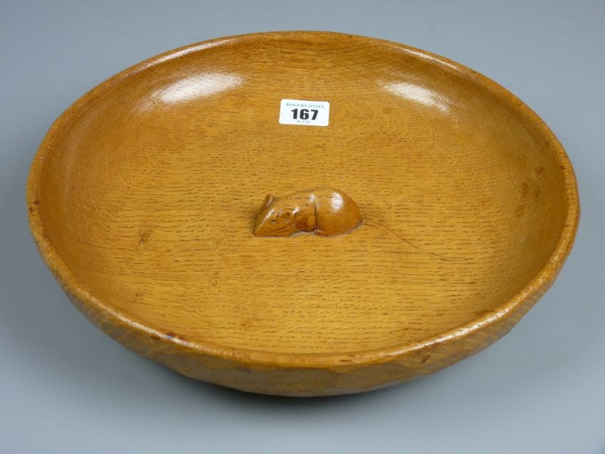 A Robert 'Mouseman' Thompson carved oak shallow bowl with central signature mouse and adzed working to the exterior, 29 cms diameter