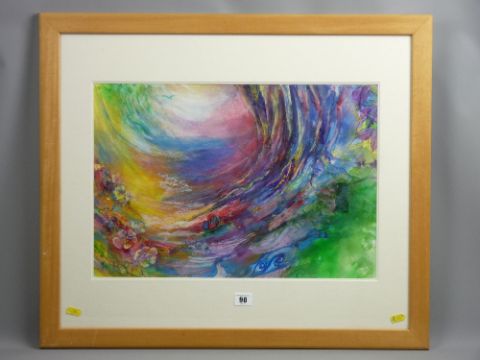 JAN GARDNER watercolour and mixed media - titled 'There were Plants and Birds and Rocks', colourful swirling dream/vision type study, signed and dated '02, artist's label verso, 34 x 50 cms