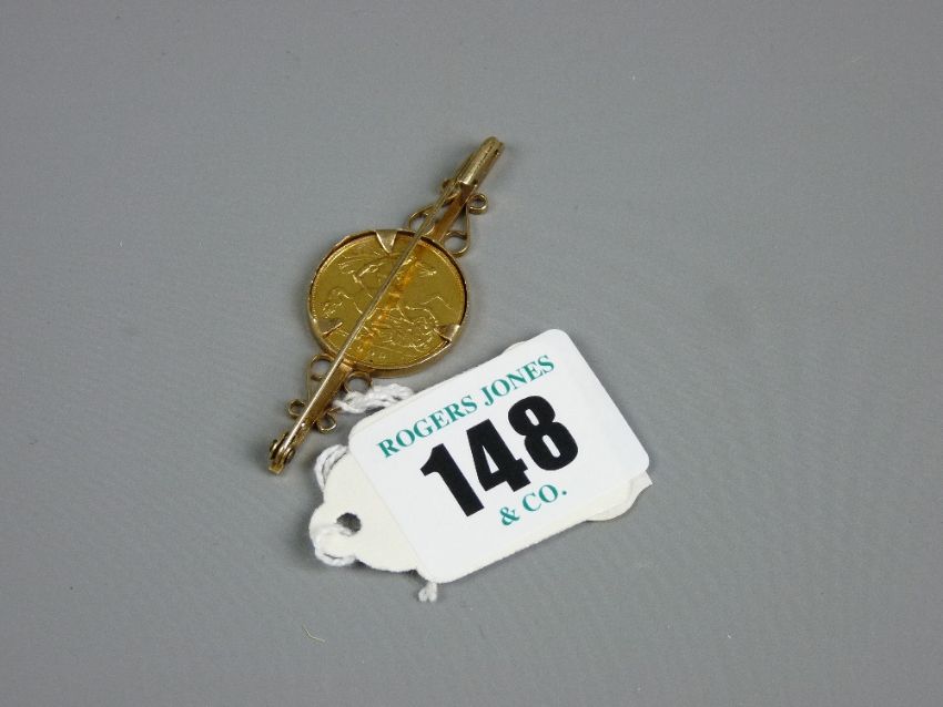 A 1909 gold half sovereign set in a full mount bar brooch with indistinct mark, possibly 375, 6.5 grms total