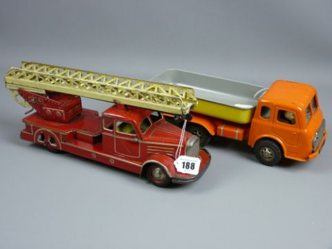 A pre-war tinplate fire engine with wind-up extending ladder, marked 'Germany', 39 cms long (clockwork mechanism missing) and a clockwork tipper truck in orange and yellow livery, marked to the base 'Made in France', 30 cms long