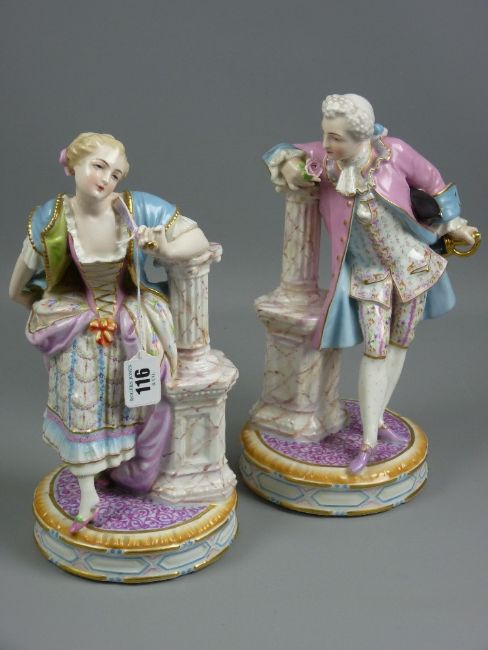 A good pair of Continental porcelain figurines, finely painted of a courting couple in colourful 18th Century costume leaning against veined marble columns on decorative circular bases with gilt highlighting (chip to sword pommel, losses to the base of both figures, possibly cherubs or animals with restorations) blue crossed swords marks beneath, 29 cms high