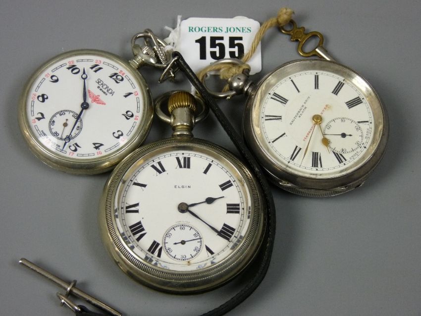Three pocket watches - a Russian Sekonda with embossed steam locomotive on rear of case, a Swiss made standard lever marked 'Kaltenbach Brothers, Neath' in a silver case and an Elgin set with Roman numerals having a subsidiary seconds dial and a heavy gauge glass cover in a sealed white metal case