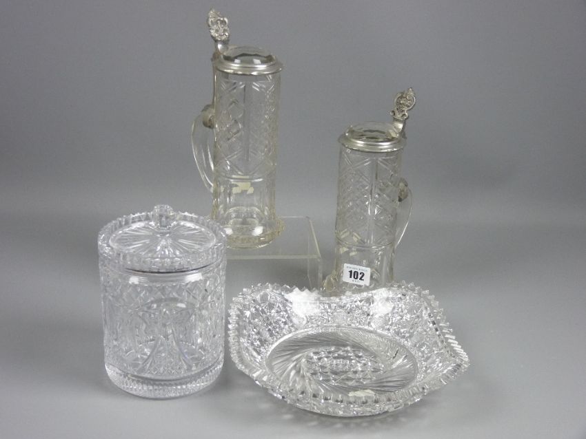 A pair of cut glass lidded steins with pewter metal mounts and facet cut lids with etched names, a heavy cut glass lidded biscuit barrel and a heavy cut glass shallow bowl