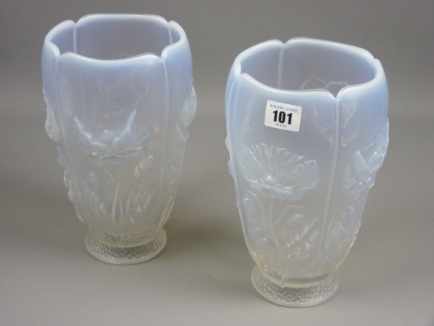 A pair of 20th Century Eastern European opalescent vases with relief moulded panels of poppies, 24 cms high