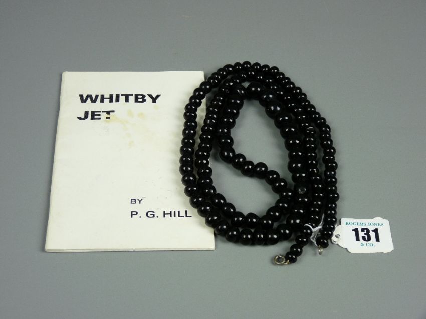 A 39 ins Whitby jet necklace of graduated beads, approximately 138 grms total weight with a booklet on 'Whitby Jet' by P G Hill