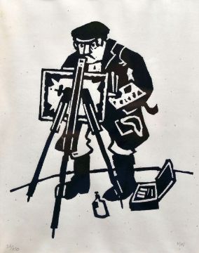 SIR KYFFIN WILLIAMS RA limited edition (34/250) lithograph - full-self portrait with the artist and easel 'en plein air', signed with initials, 24 x 19cms