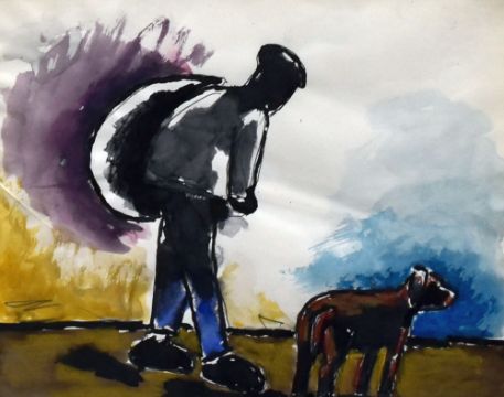 JOSEF HERMAN watercolour - workman carrying sack beside dog, 20 x 25cms