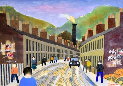 WILLIAM COOPER (b.1923 Merthyr Tydfil) mixed media, newspaper collage and construction - Welsh valleys street scene with figures and political graffiti, entitled verso 'This is Your Life', signed and dated verso 1987, 23 x 34cms