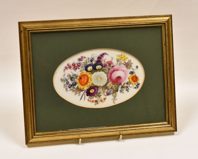 SWANSEA PORCELAIN - framed plaque, London decorated with a large spray of flowers, visible area 18cms long