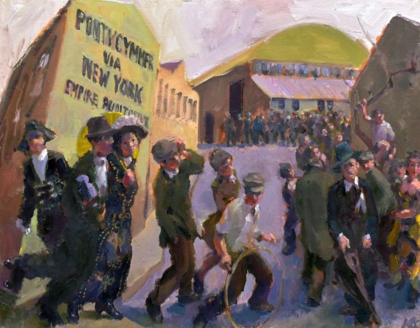 KEVIN SINNOTT oil on canvas - a multitude of figures and characters between buildings, one building emblazoned with the slogan 'PONTYCYMMER VIA NEW YORK EMPIRE AUDITORIUM', signed with initials, unframed, 56 x 71cms Artist's note: The 1st of my "history" paintings, done in 2012 on first hearing about the arrival of the music hall family, The Andersons, into Pontycymmer c1908