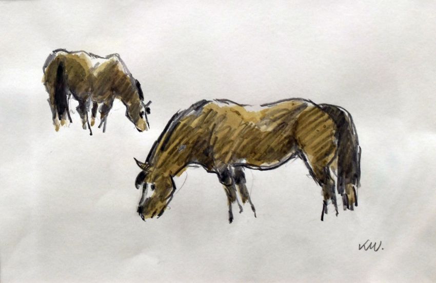 SIR KYFFIN WILLIAMS RA watercolour and pencil - study of two standing ponies, signed with initials, 25 x 38cms