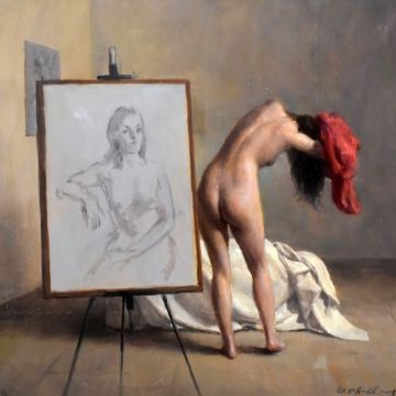 HARRY HOLLAND oil on board - nude drying hair beside artist's large canvas, signed, unframed, 33 x 35cms