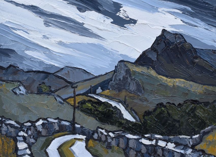 DAVID BARNES oil on board - mountainous landscape with dry-stone walls, road, telegraph poles and cottages, signed with initials, 29 x 39cms
