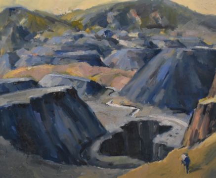 GARETH PARRY oil on board - quarried North Wales landscape with figure painting, entitled verso 'Peintio'r Tomenydd Llechi, Gwynedd' (Painting the Slate Tips, Gwynedd), signed 50 x 60cms