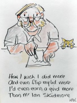 SIR KYFFIN WILLIAMS RA pencil and watercolour - caricature of writer and broadcaster Ian Skidmore, writing in the company of his cat, inscribed with poem by the artist below 'How I wish i did more, And even flip my lid more, I'd even earn a quid more, Than Mr Ian Skidmore', signed with initials, 31 x 23cms