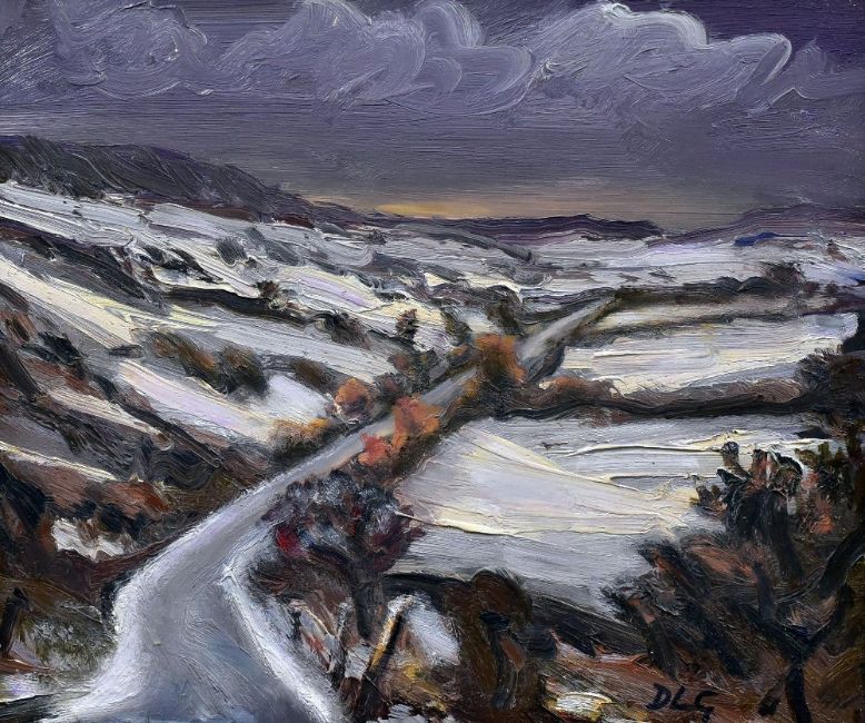 DAVID LLOYD GRIFFITH oil on board - Snowdonia in winter, entitled 'Snow on Hiraethog', signed with initials, 32 x 38cms
