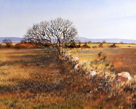 DAVID TRESS watercolour - expansive landscape with stonewall and tree, signed and dated 1986, 50 x 63cms