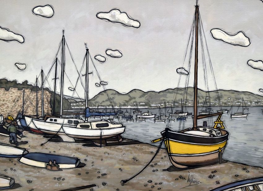 ALAN WILLIAMS acrylic on Arches watercolour paper - beached boats next to castle-walls, entitled 'Conwy, Looking to Deganwy', signed, 43 x 61cms