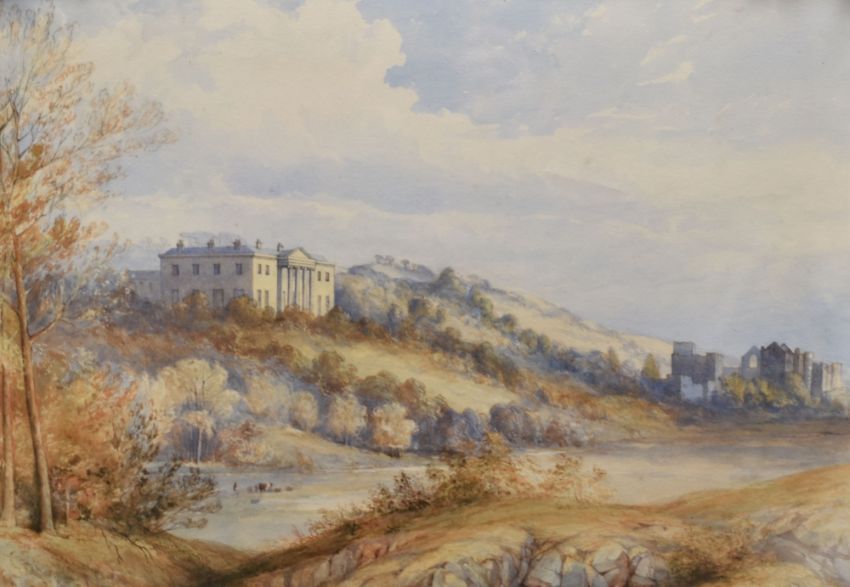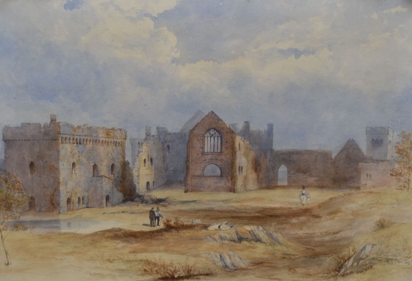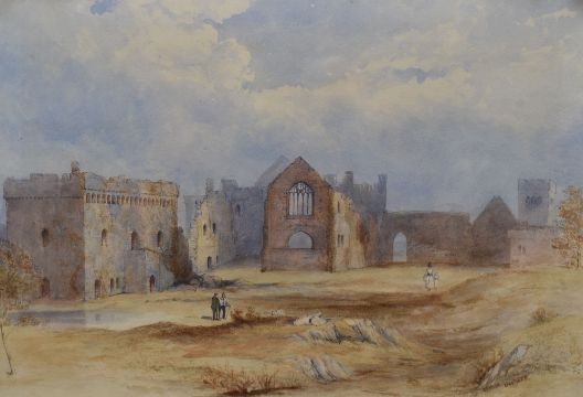 NINETEENTH CENTURY ENGLISH SCHOOL watercolours, a pair - both Pembrokeshire historical views, the first being a study of Bishop's Palace, Lamphey with figures and the second being the surrounding landscape including the imposing Georgian mansion which is now the Lamphey Court Hotel with Bishop's Palace in the valley below, both monogrammed MHM and dated December 1853, in good antique ornate gilt frames, 33 x 47cms