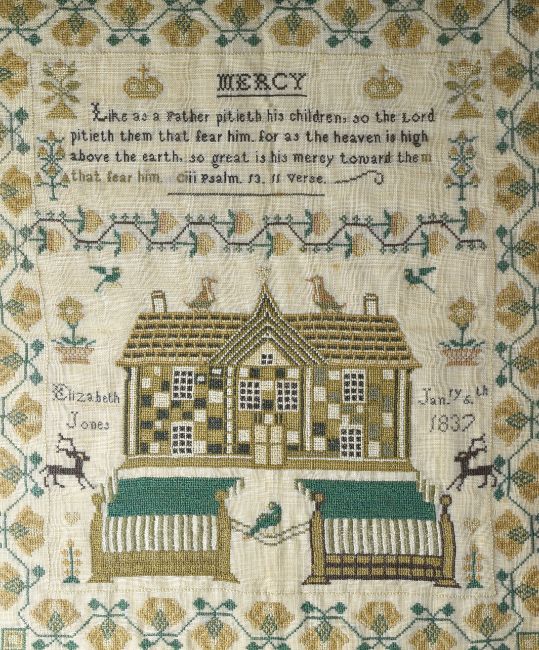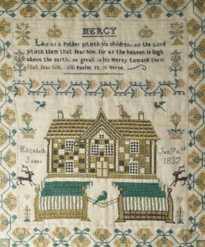 ELIZABETH JONES - a good needlework sampler bearing religious 'Mercy' psalm above a school-house and with parrots and deer within a continuous motif border, dated January 6th 1837, contained within a nineteenth century carved frame, 33 x 27cms (excl. frame) Provenance: by descent within a West Wales family