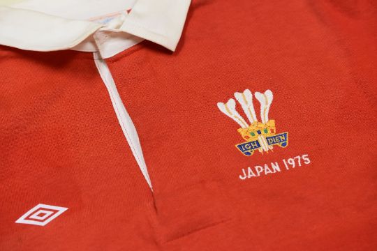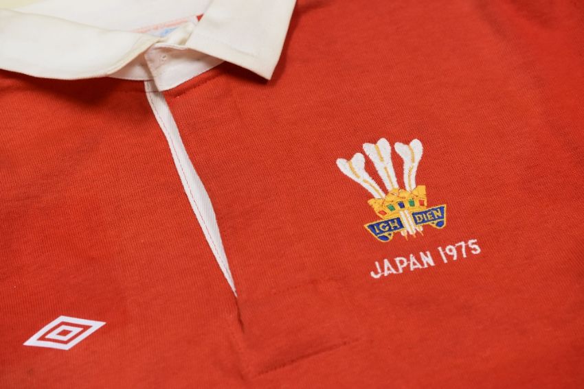 A 1975 WALES INTERNATIONAL RUGBY UNION SQUAD JERSEY FROM JAPAN TOUR Condition: excellent, no number to reverse, embroidered crest with 'JAPAN 1975' Provenance: presented by Gareth Edwards to Cwmtwrch RFC