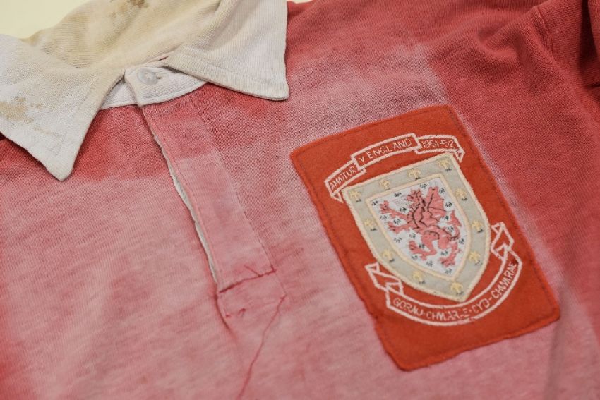 WALES V ENGLAND AMATEUR SOCCER JERSEY FROM 1951, MATCH-WORN BY IDWAL ROBLING Condition: some fading to folded exposed areas and a few small holes mainly to sleeve, complete with felt Wales crest that reads 'AMATEUR v ENGLAND 1951-52' Provenance: Pontardawe RFC