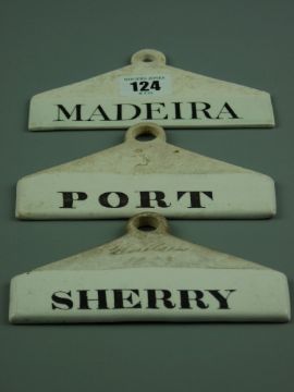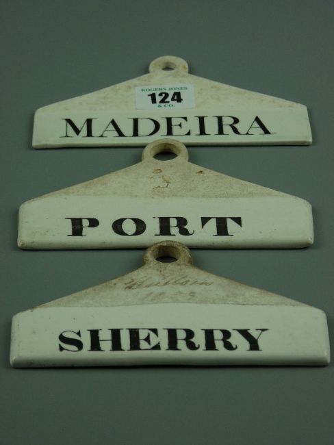 Three semi-glazed pottery bin labels marked 'Madeira', 'Port' and 'Sherry', impressed ciphers to the rear of all, the Madeira label marked Wedgwood, 14 cms approximately across
