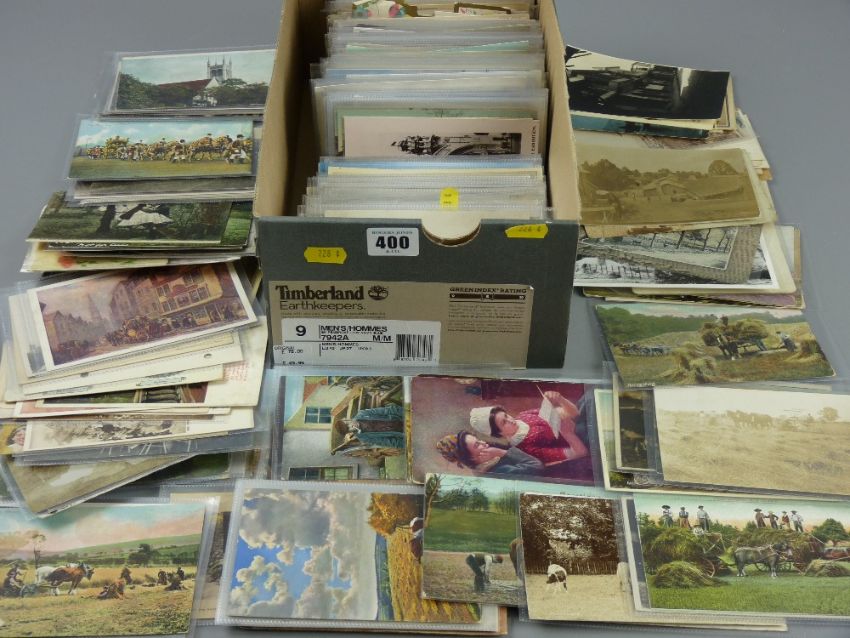 Postcards - a large quantity (shoebox full) of postcards, many plastic sleeved, subject including farming, sweetheart postcards, vintage fairgrounds, royalty etc