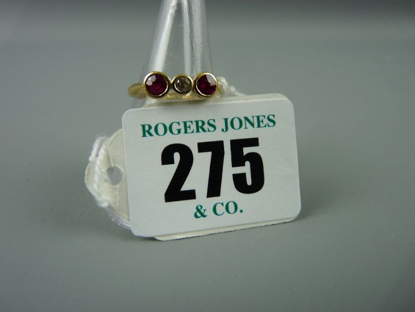 An eighteen carat gold dress ring having a centre round cut diamond with flanking round cut rubies, 2.5 grms gross, size L
