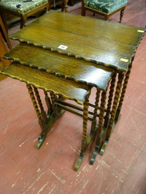 A nest of three oak wavy top side tables with barley twist supports, 68 cms high, 50 cms wide, 32 cms deep the largest