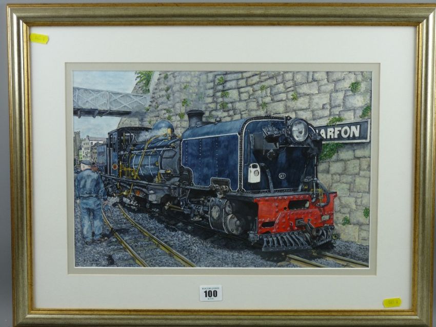 JULIE WILLIAMS (of Anglesey) watercolour - Welsh Highland locomotive standing alongside the walls at Caernarfon, signed, 28 x 41 cms
