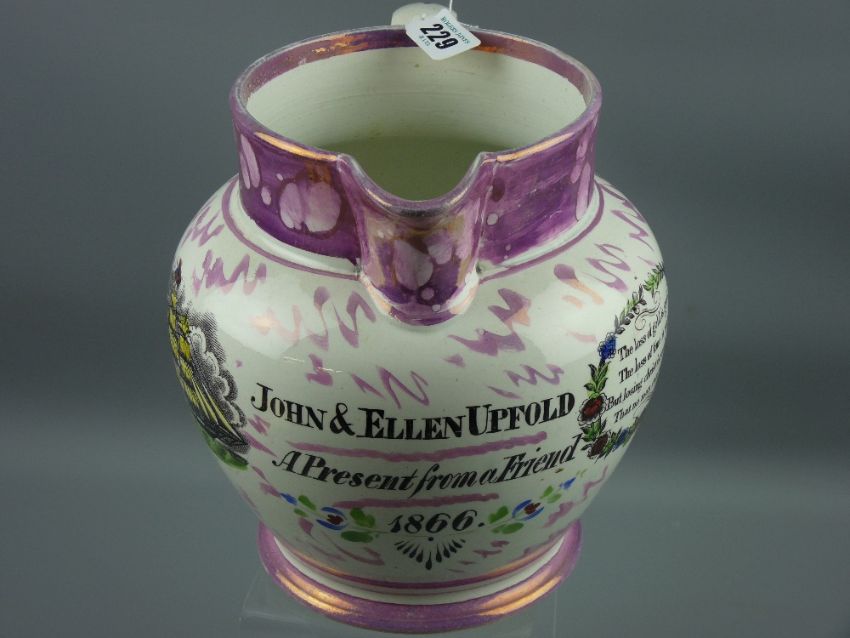 Sunderland lustre - a fine large sailor's jug 'John and Ellen Upfold, a Present From a Friend, 1866' with scenes of threemaster 'Great Australia', 'Come Box the Compass', 'An East View of The New Bridge, Sunderland' and 'The Loss of Gold is Great, The Loss of Time is More, but Losing Christ is Such a Loss That No Man Can Restore', 23 cms high