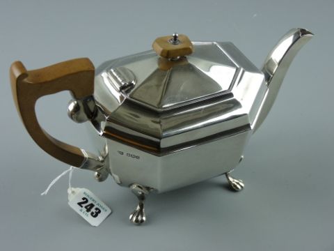A silver teapot of oblong plain panelled form on four claw supports and with composition handle and knop, 19 ozs gross, Sheffield 1936