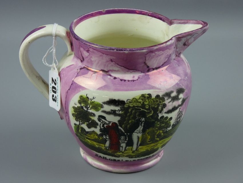 Sunderland lustre - a sailor's farewell jug with 'The Sailor's Tear', 12 cms high (repaired spout)