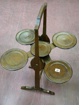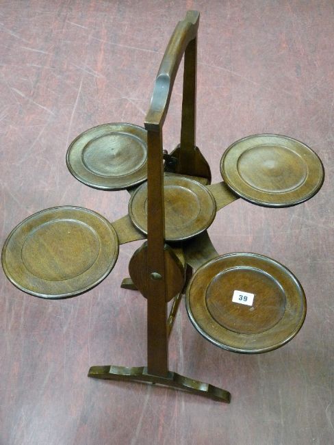 An Edwardian mahogany monoplane multi-tray folding cakestand with attached patent label